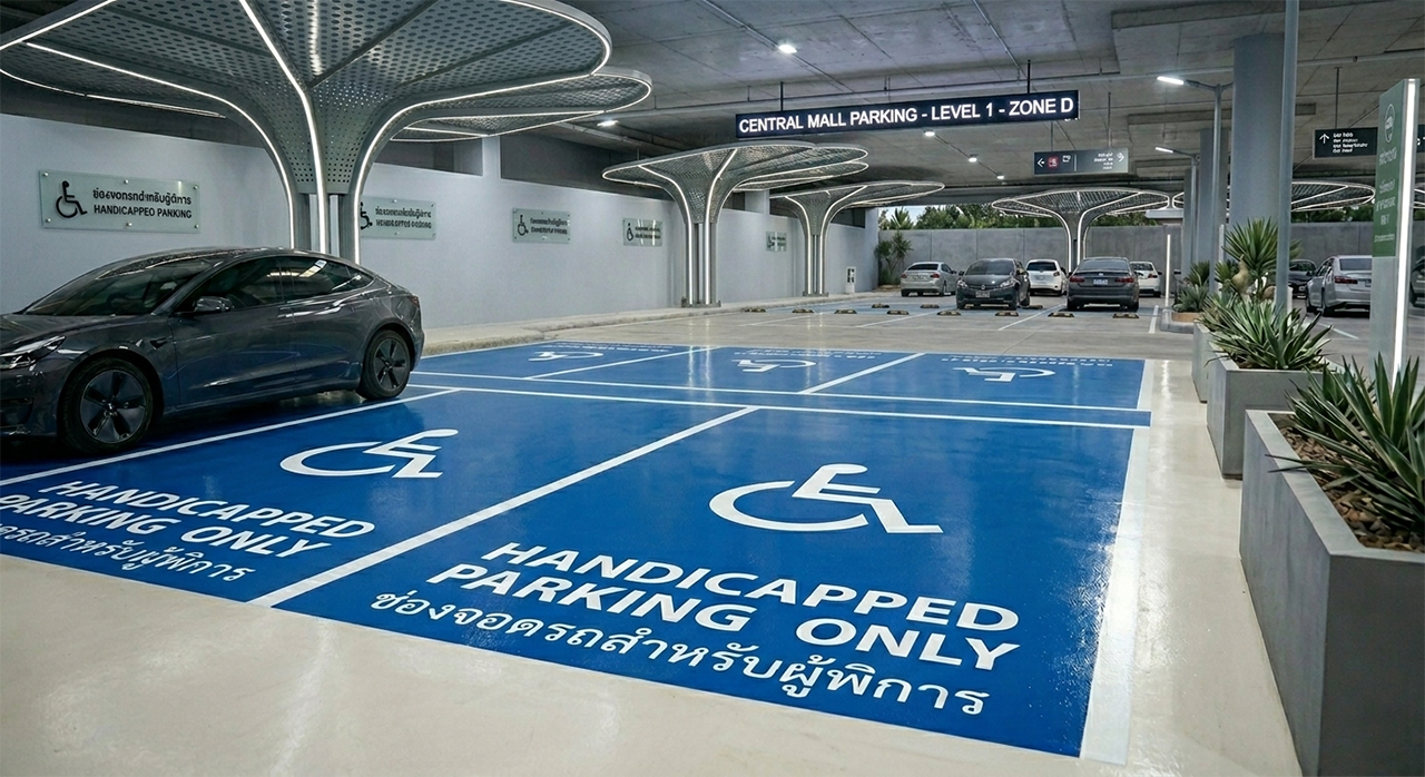 ออกแบบและติดตั้งระบบพื้นสำหรับช่องจอดรถพิเศษ เช่น EV Charger, VIP Parking, ช่องจอดคนพิการ พร้อมงานสัญลักษณ์และเคลือบผิวทนทาน