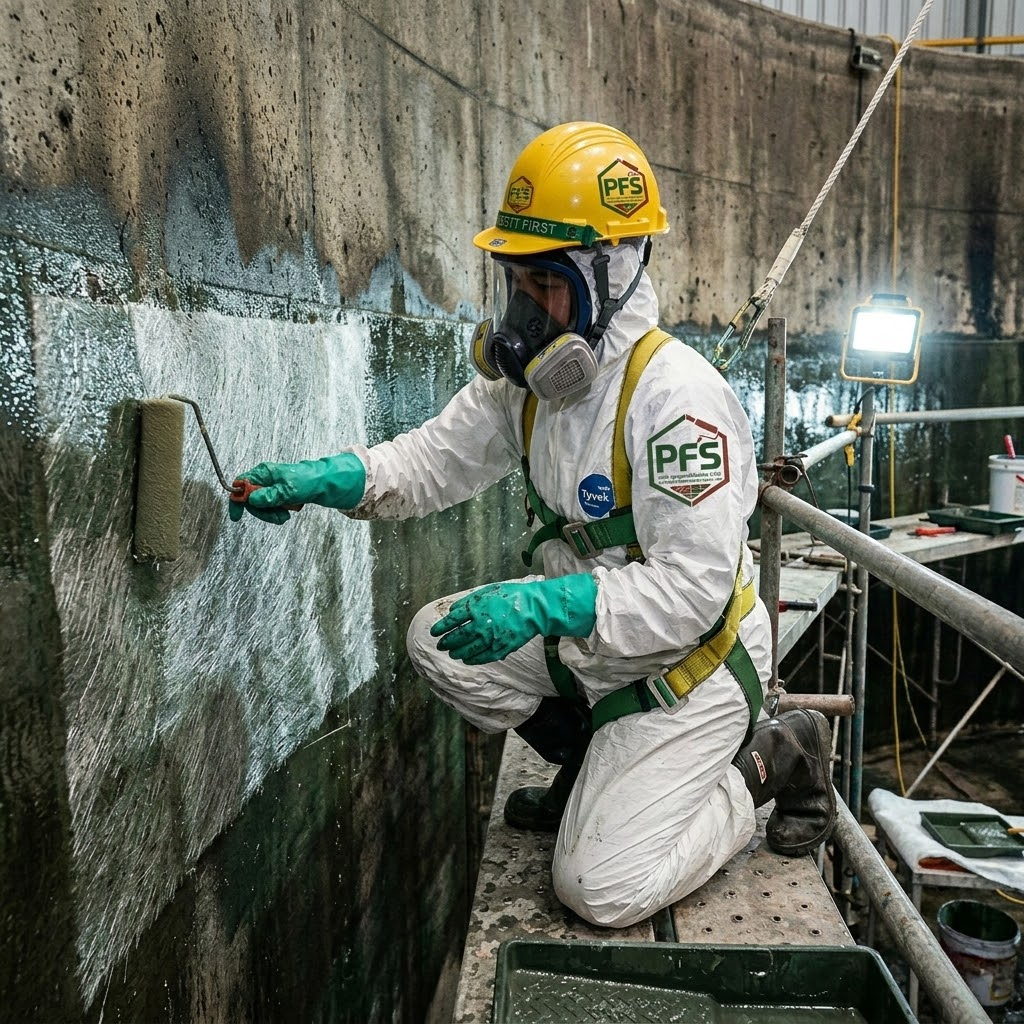 งานเคลือบป้องกันการกัดกร่อนด้วยไฟเบอร์กลาส เหมาะสำหรับพื้นที่สัมผัสสารเคมี ถังบำบัด บ่อ และโรงงานอุตสาหกรรมที่ต้องการความทนทานสูง